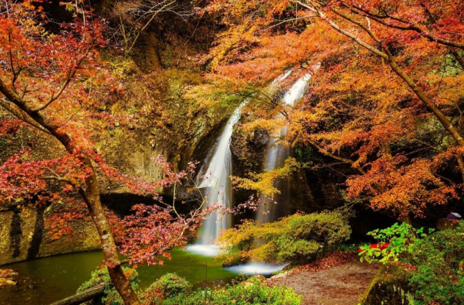 일본 3대 아름다운 폭포 중 하나인 후쿠로다 폭포를 방문하고 아름다운 단풍 풍경을 배경으로 장엄한 폭포를 즐겨보세요.
