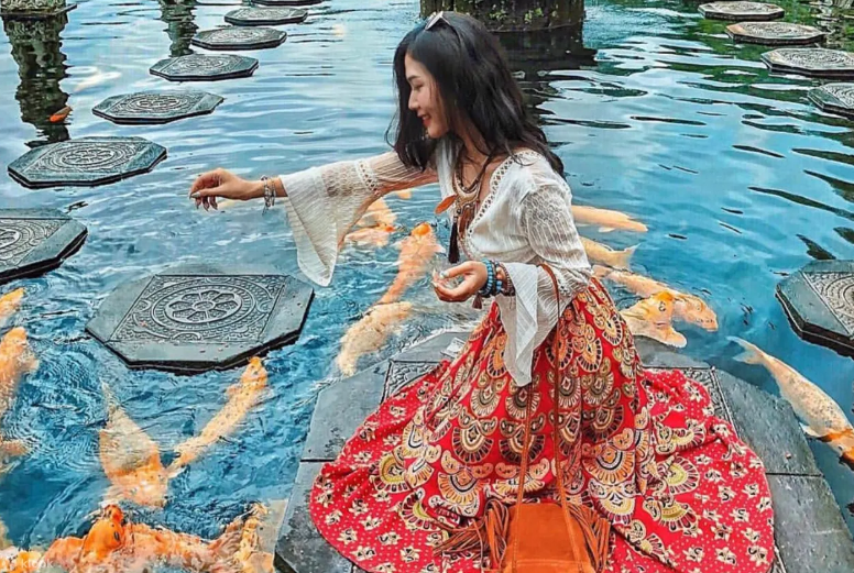 티르타 강가 수상궁전을 방문하고 물고기에게 먹이를 주며 사진을 찍어보세요.