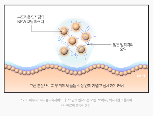 피부를 부드럽게 감싸는 커버 파우더와 얇게 밀착되는 오일이 고르게 분산되어