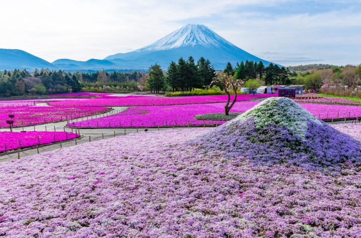 후지산 기슭에 피는 기간 한정 500,000그루의 분홍색 시바자쿠라 꽃을 감상해보세요.