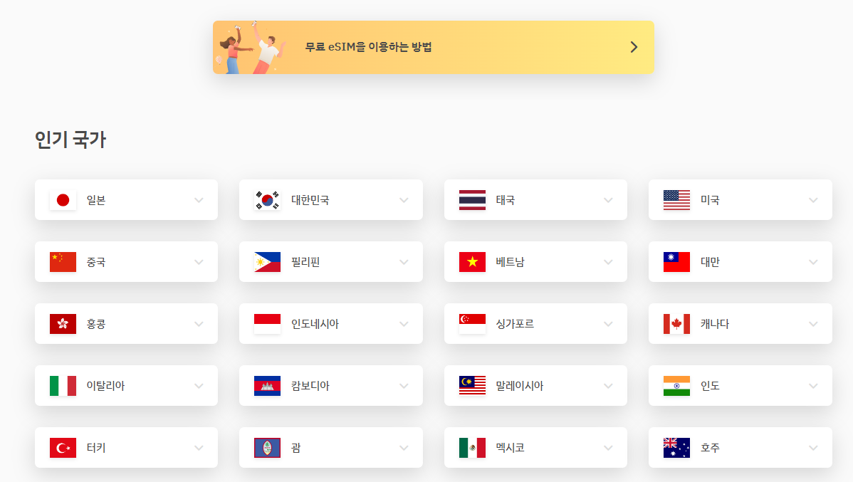 - 여행할 국가 또는 지역을 검색하여 알맞은 eSIM 요금제를 선택합니다.