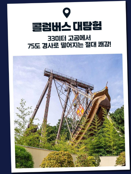 T 익스프레스, 콜럼버스 대탐험, 롤링엑스트레인 등 아찔한 놀이기구를 체험해보세요.
