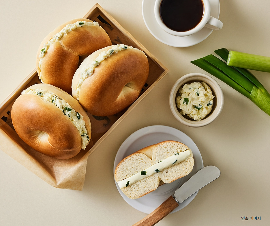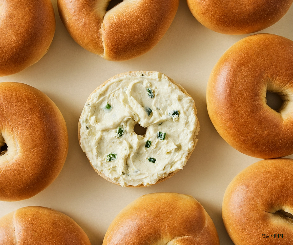 끓는 물에 15초간 데친 뒤 구워 베이글의 쫄깃함이 살아 있어요. 줄서서 먹던 전문점식 그 맛! 대파크림치즈를 그대로 구현!