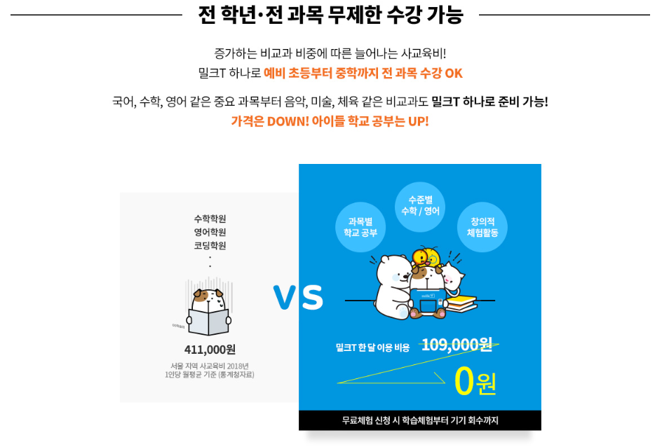 밀크T 스마트학습은 전 학년, 전 과목에 대한 무제한 수강이