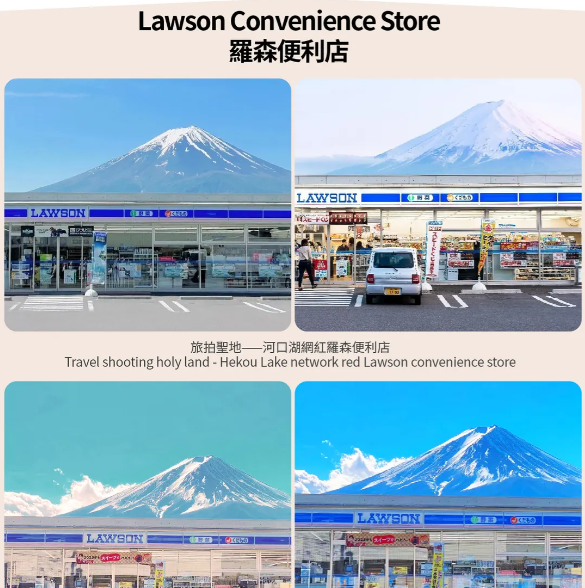 첫 번째 정류장: 📸여행 사진의 성지 로손 편의점🏰. 사람과 편의점, 그리고 눈 덮인 후지산 정상이 함께 어우러져 클래식한 사진을 만들어냅니다.