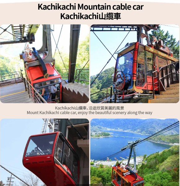 세 번째 정류장: 가치카치 산 케이블카 또는 텐하루 센고쿠 쇼군 에어 보트 카와구치 호수 기슭에서 가치카치 산 케이블카를 타고 길을 따라 아름다운 풍경을 즐겨보세요. 강풍, 낙뢰 등으로 인해 로프웨이 운행이 중단될 수 있습니다. (무료 사항입니다. 기상 상황으로 인해 로프웨이 탑승이 불가능할 경우, 가와구치 호수의 센고쿠 쇼군 보트로 일정이 변경됩니다. 그렇지 않으면 티켓 수수료가 환불됩니다)