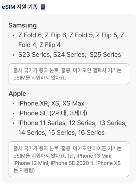eSIM을 먼저 구매한 후, 휴대폰이 eSIM 미지원 기종임을 뒤늦게 알게 된다면 여행지에서 인터넷 연결이 안 되거나 현지 데이터를 새로 구매해야 하는 불편을 겪으실 수 있어요. 그렇기 때문에 여행 데이터 구매 전, eSIM 지원 기종을 꼭 확인해보시길 바랍니다!