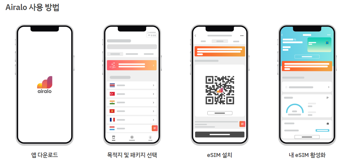 Airalo 앱 설치 후, 국가 선택 → 요금제 확인 → 결제 → QR코드 스캔 또는 앱 내 설치로 매우 간단합니다.