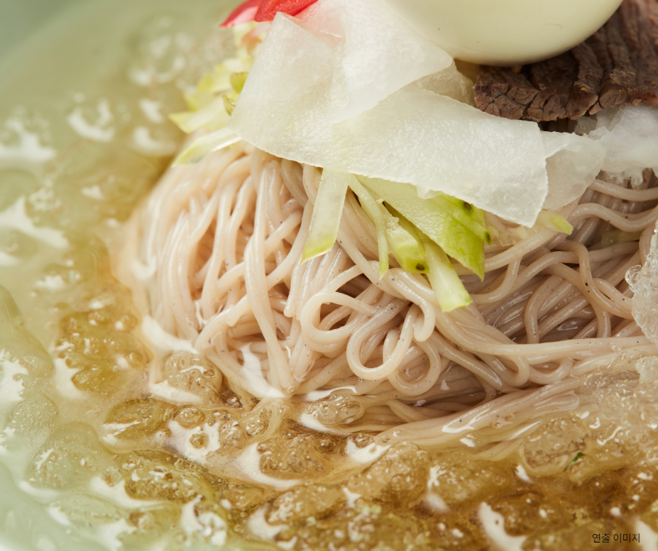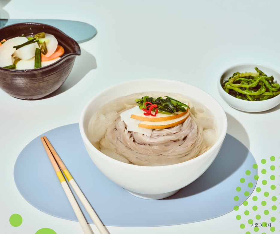 30초만 면을 삶아 차가운 물에 헹군 후, 동치미 육수와 함께 후루룩~