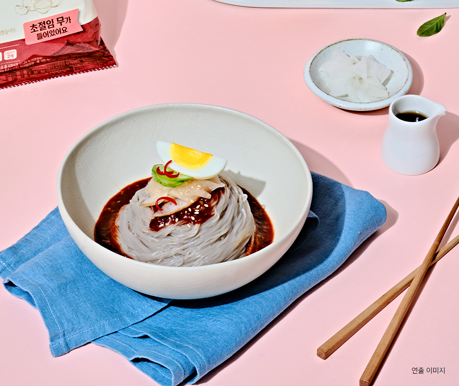 허전하다 싶을 땐 별첨한 초절임 무를 넣어보세요. 비빔장과 상큼한 초절임 무를 함께 비벼 한 그릇 담으면 제대로 차린 함흥 비빔냉면 한 상이 뚝딱 완성됩니다.
