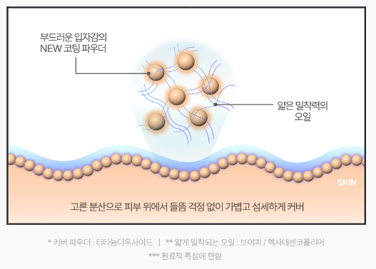 피부 위에 촘촘하게 레이어링 되어 자연스럽고