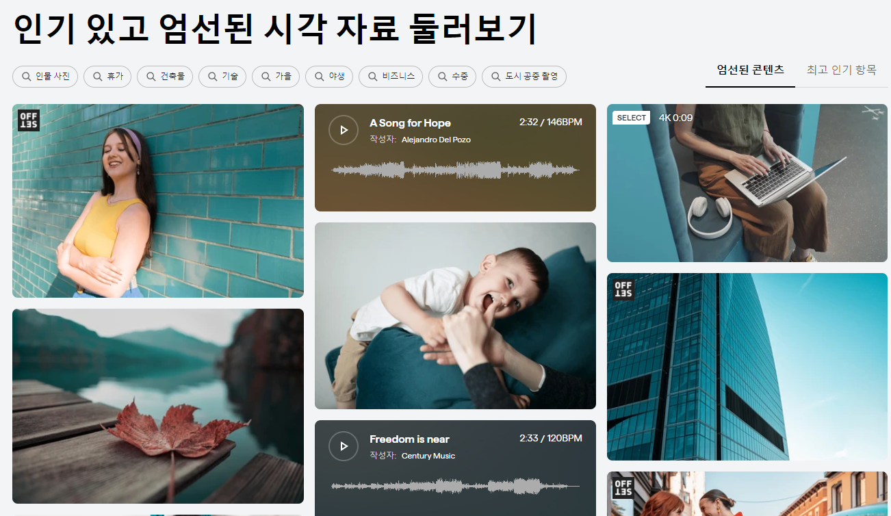 광범위한 콘텐츠 라이브러리: 수백만 개의 이미지와 영상이 매일 업데이트되어 최신 트렌드를 반영합니다.
