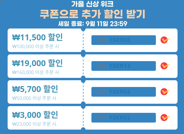 구매후기에 앞서 11일 까지 사용가능한 프로모션코드(할인코드)를 공유해드릴게요.