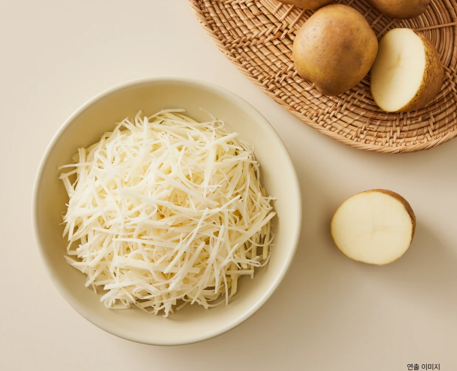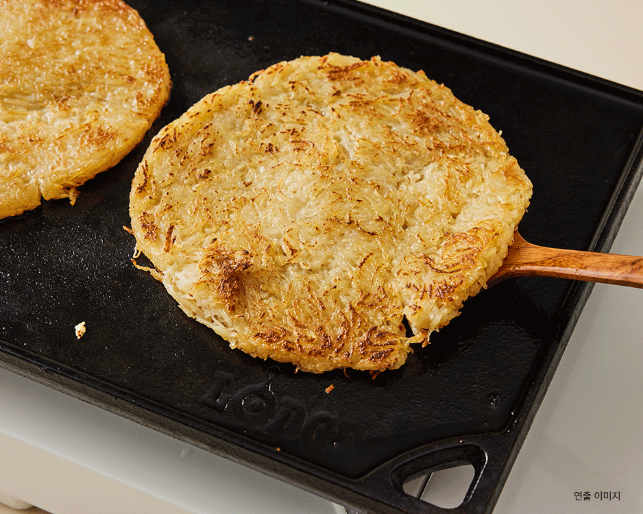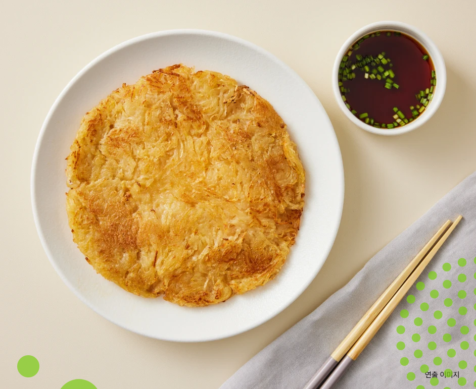 기름 냄새가 그리운 날, 냉동실에서바삭하고 고소한 감자채전을 꺼내 보세요. 감자채를 얇게 컷팅한 뒤 철판에서 튀기듯 부친 감자채전이랍니다. 감자 함유량이 높아 입 안 가득 고소한 감자의 풍미를 느낄 수 있고요. 마지막 한 입까지 바삭하답니다. 안주 또는 간식, 밥 반찬까지 두루두루 활용도가 높을 거예요.