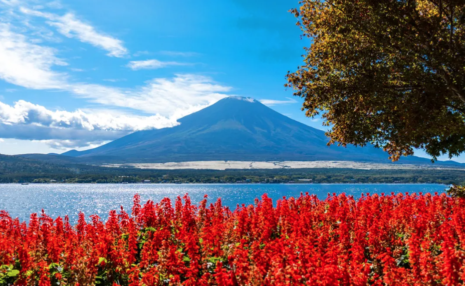 가와구치코 오이시 공원: 여름에는 라벤더가 만개하고 가을에는 빗자루처럼 생긴 코키아가 붉게 물들어 후지산의 풍경과 조화를 이루며 자연과 아름다움의 완벽한 조화를 선사합니다.