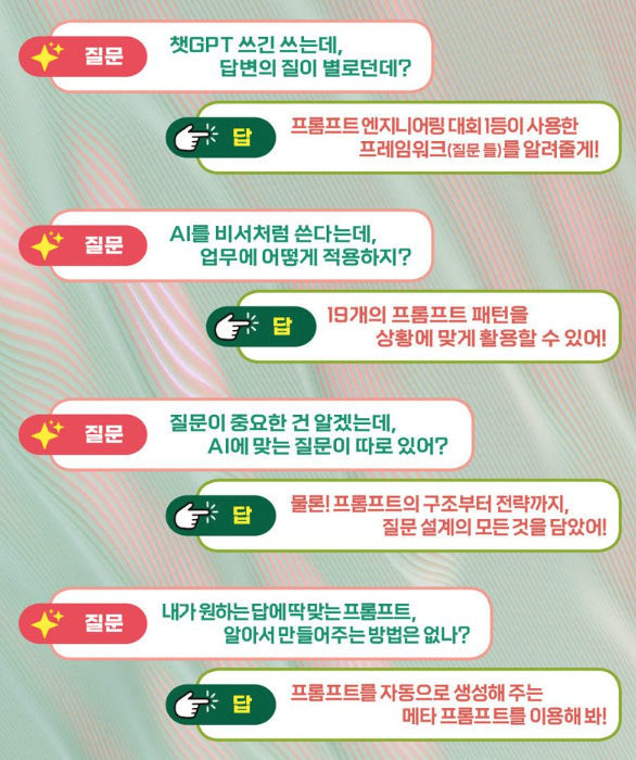 과거에는 컴퓨터 프로그래밍 언어를 배워야 컴퓨터와 소통할 수 있었다. 그런데 이제는 인간의 언어로 AI와 직접 대화하는 시대가 되었다. 그만큼 많은 사람이 이용할 수 있게 되었고 누구나 질문을 던지면 필요한 정보를 얻을 수 있다. 하지만 더 효과적인 소통 방법을 아는 사람일수록 AI가 가진 방대한 지식에서 필요값만 뽑아내 나만의 결과값을 얻어낼 수 있다.