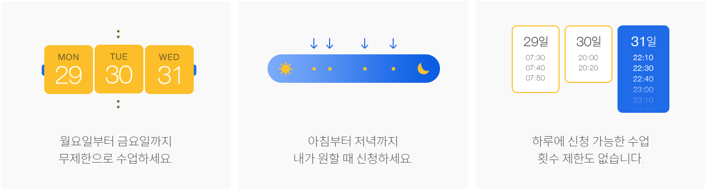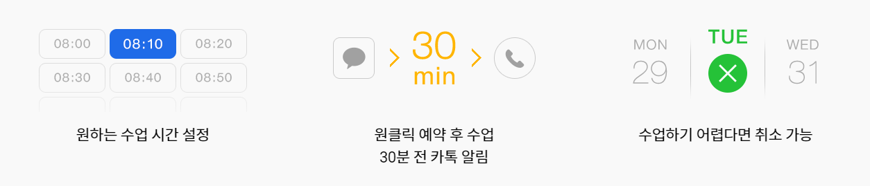 · 꾸준한 무제한 학습을 위해 선호 수업시간을 선택하면 매일 가능 여부를 알려주고 예약을 돕는 세계 최초의 서비스 |
