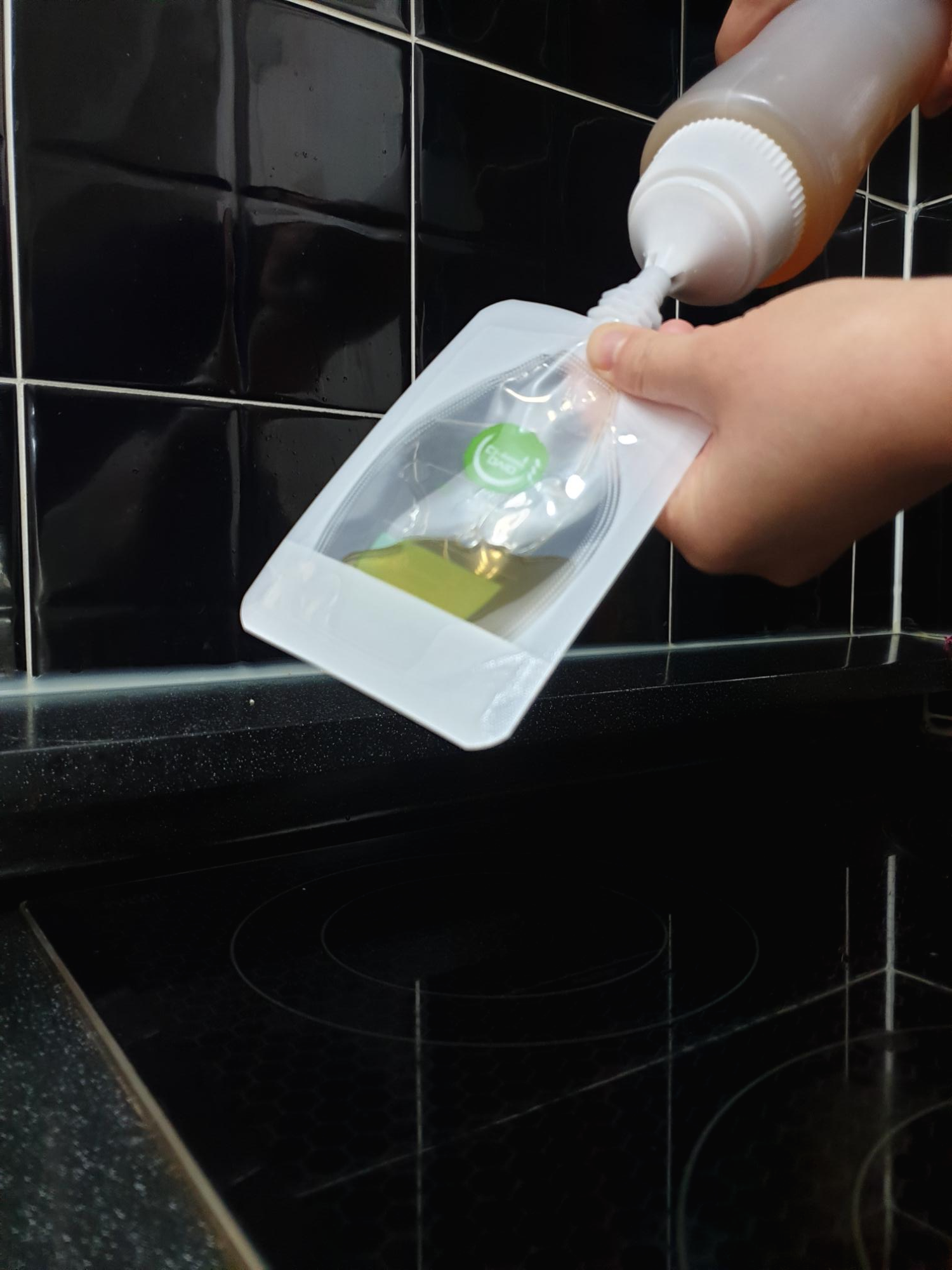 여기서 부터가 진짜 담통의 장점을 느끼실수 있어요. 깔때기 사용하는 것보다 훨씬 간편하고 쉽게 포장이 가능하거든요.