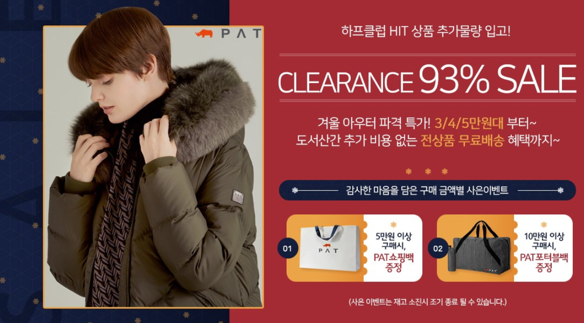 PAT 브랜드에 한해서 무료배송 혜택에 구매 금액별 사은이벤트를 진행하고 있어요.