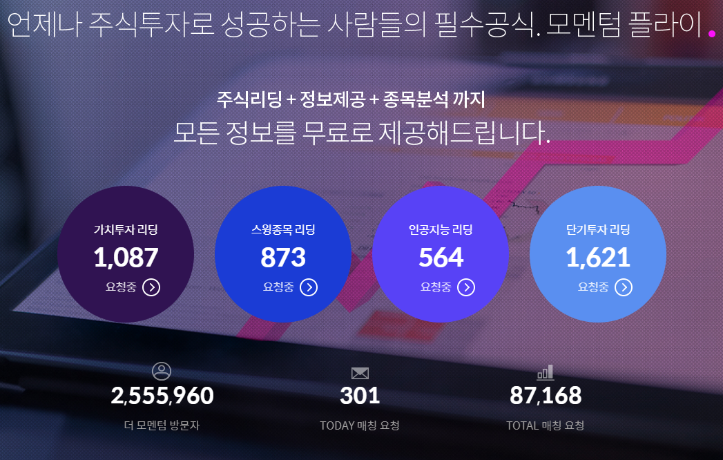 모멘텀플라이는 국내 수 많은 주식정보 제공 및 리딩 서비스기업 중