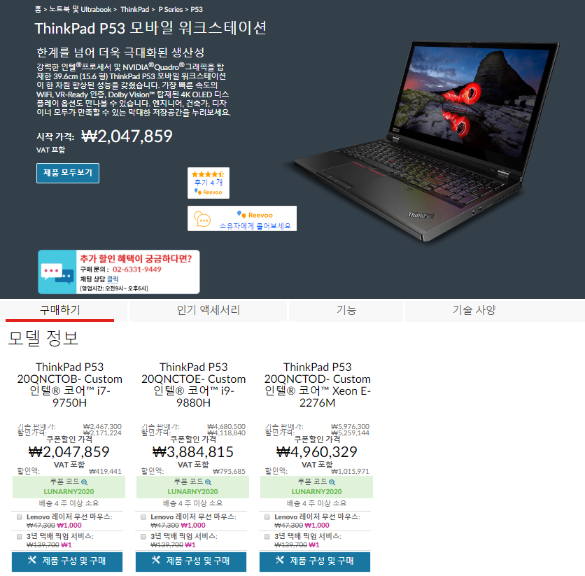 레노버 온라인 스토어에서 씽크패드 P53의 가격은
