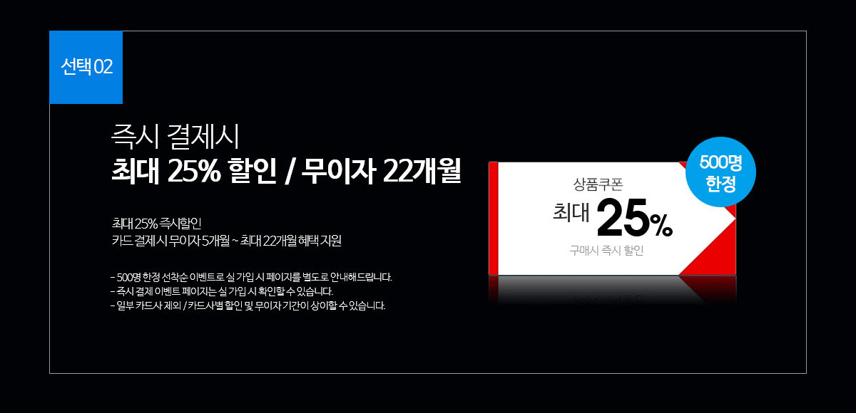 - 즉시 결제 최대 25% 할인 + 22개월 무이자 혜택 + 25% 요금할인 까지
