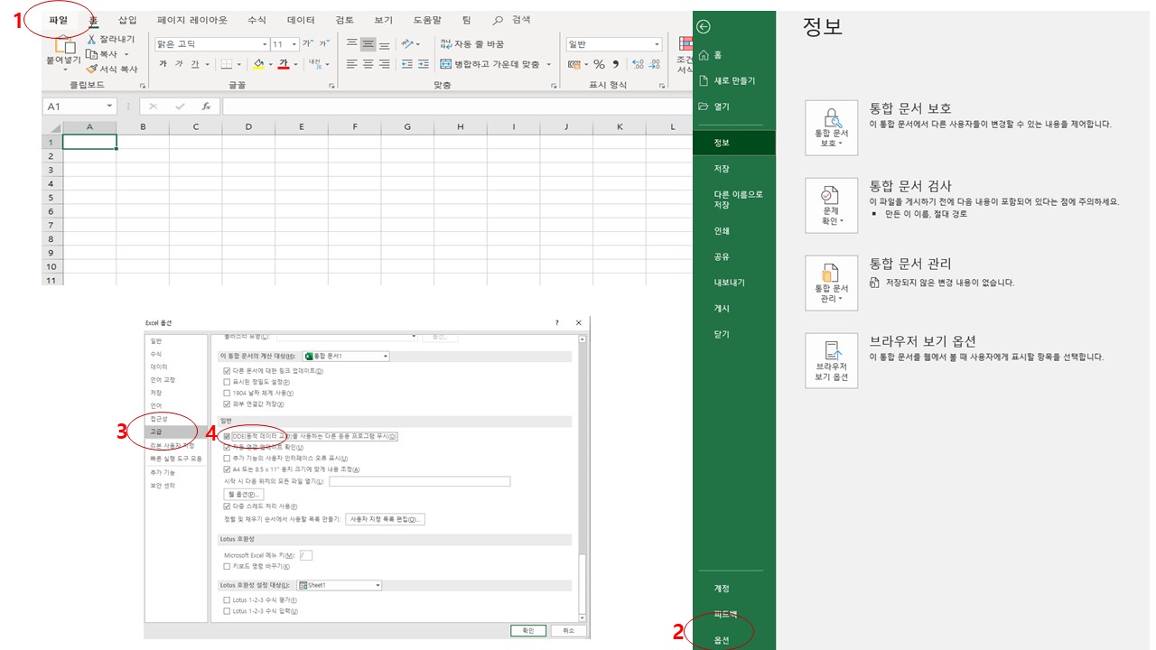 엑셀 옵션에 DDE(동적데이터 교환)를 사용하는 다른 응용 프로그램 무시 하는 란이 있어요.
