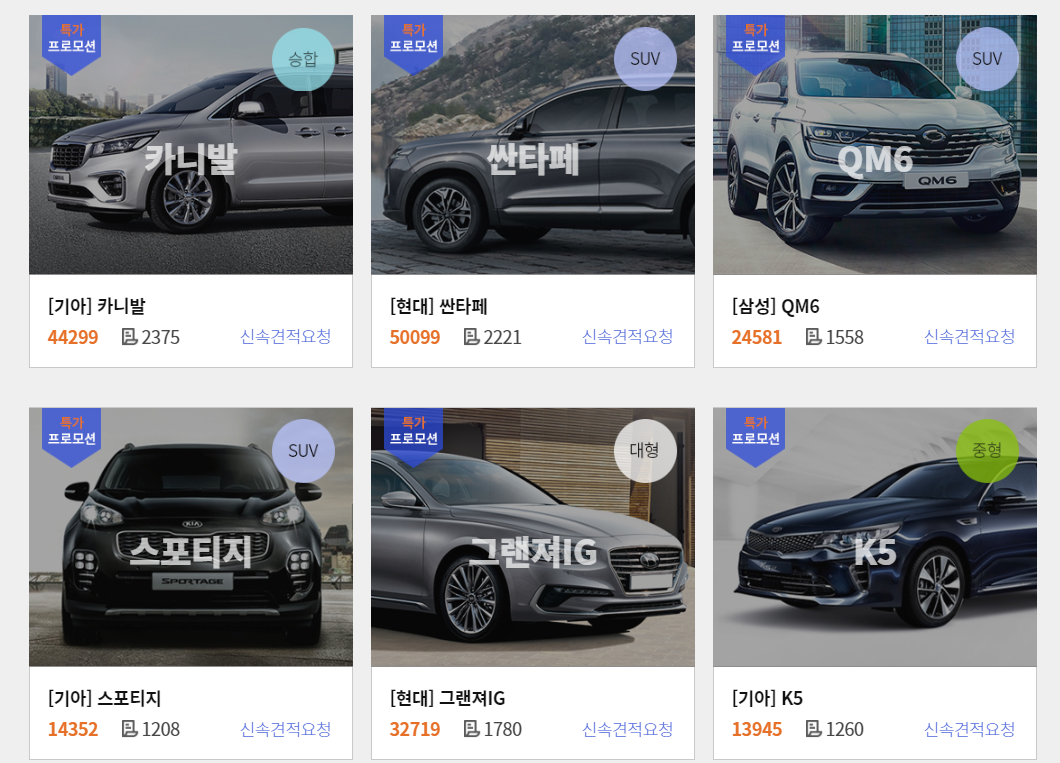카니발 싼타페 QM6 스포티지 그랜져IG K5을 진행하고 있어요.