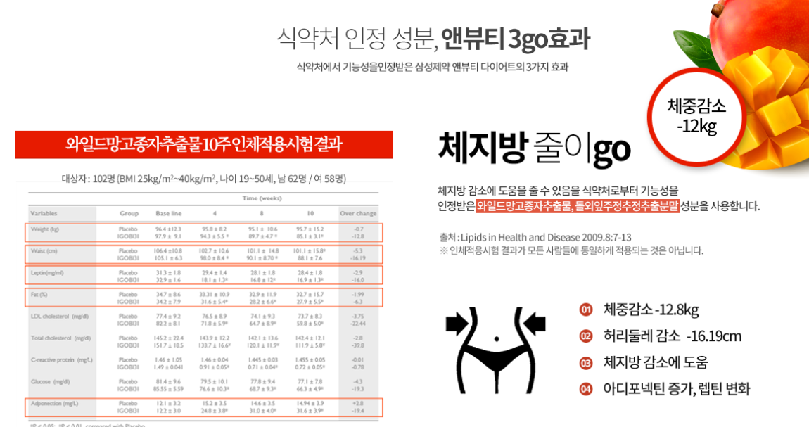 앤뷰티다이어트의 성분은 체중 감량은 물론 체지방 감소,혈중 콜레스트롤 개선에 도움을 주어