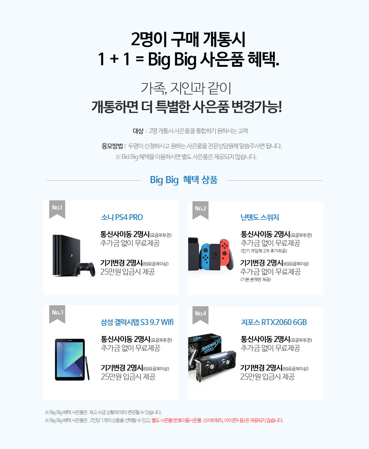 - 2명 이상 개통시 소니 플스 PS4 Pro, 닌텐도 스위치, 삼성전자 갤럭시탭S3 9.7 WiFi, 그래픽카드 지포스 RTX2060 6GB 중 1택