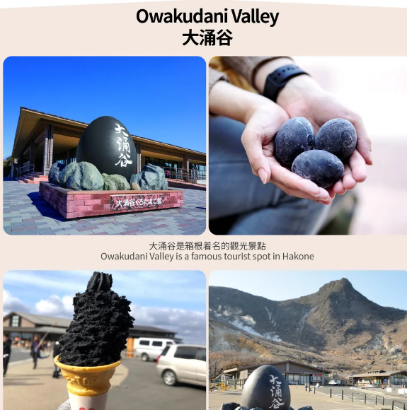 🌋오와쿠다니: 하코네의 유명 관광지로, 유명한 간식 중 하나인 검은 계란은 "하나 먹으면 수명이 7년 늘어난다"는 전설이 있습니다.