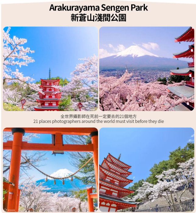 첫 번째 정류장: 🌄후지산 5합목/⛩️아라쿠라야마 센겐 공원, 같은 해 4월 26일부터 11월 30일까지 후지산 5합목으로 이동하고, 12월 1일부터 이듬해 4월 25일까지 아라쿠라야마로 이동 아사마 공원⛩️. 후지산 고고메는 산 중턱에 위치해 있으며, 후지산과 가장 가까운 거리에서 정상을 올려다보면 장엄한 아름다움을 느낄 수 있으며, 주변 풍경과 가와구치 호수 등을 한눈에 바라볼 수 있습니다. 구름이 가려지면 아름다운 운해를 바라볼 수 있습니다. 아라쿠라야마 센겐 공원은 '전 세계 사진가들이 죽기 전에 꼭 가봐야 할 장소 21곳' 중 하나로 알려져 있습니다. 후지산의 전경을 감상할 수 있는 최적의 장소📸 '오층탑과 후지산, 산 아래 거리 풍경'을 한 번에 촬영할 수 있는 곳입니다. 이 풍경을 즐기러 여기로 오세요.