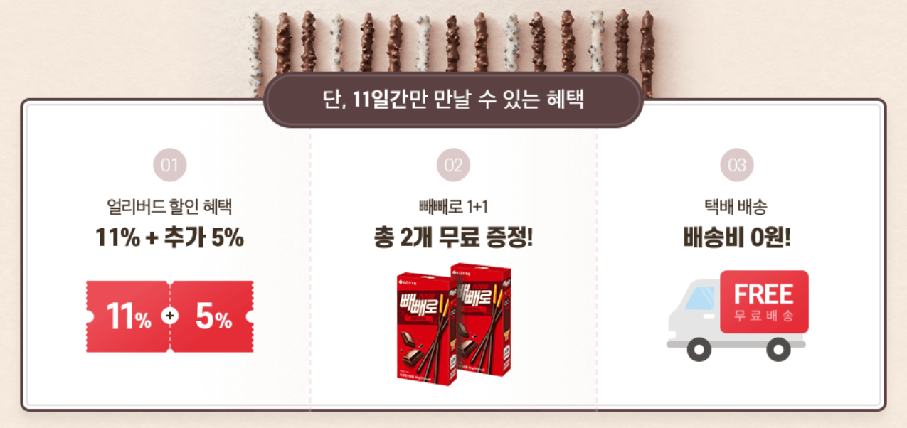 추가할인에서 빼빼로와 배송을 무료로 증정하는 이벤트에요.