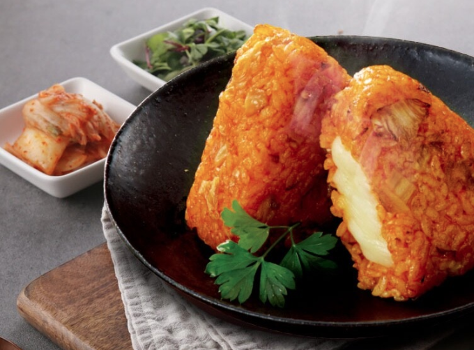 한손으로 편리하게 즐길 수 있는 김치지즈 주먹밥이에요.