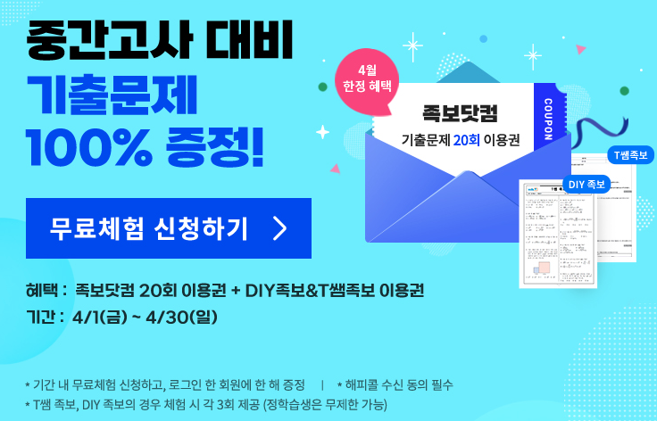 그래서 꼭 무료체험을 해보시고 덤으로 중간고사 기출 문제까지 받으신 다음
