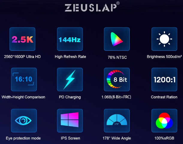 [2.5K QHD 16:10] ZEUSLAP-P16KT 16:10 노트북 디자인의 주요 패션 디스플레이 인 16:10 종횡비에서 16 인치 IPS 패널이있는 QHD 해상도 2560*1600 P를 갖추고 있습니다.