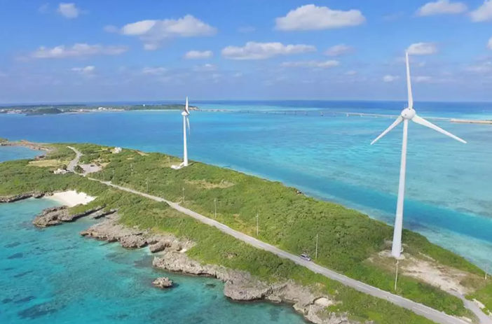 웨스트핑안곶 오른쪽이 이케마오하시, 왼쪽이 이라부섬입니다. 근처에는 미야코지마의 랜드마크 건물 중 하나인 높은 풍차 발전소가 있습니다.