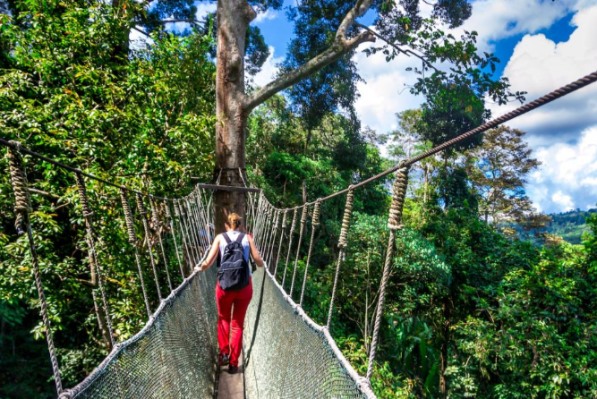 포링 캐노피 워크웨이(Poring Canopy Walkway) 현수교에서 담력을 테스트하고 사바(Sabah)의 자연 경관을 조감해 보세요. 길이 175m가 넘는 다리, 지상 40m가 넘는 높이에 위치한 8층 건물보다 높은 구조물을 탐험해보세요.