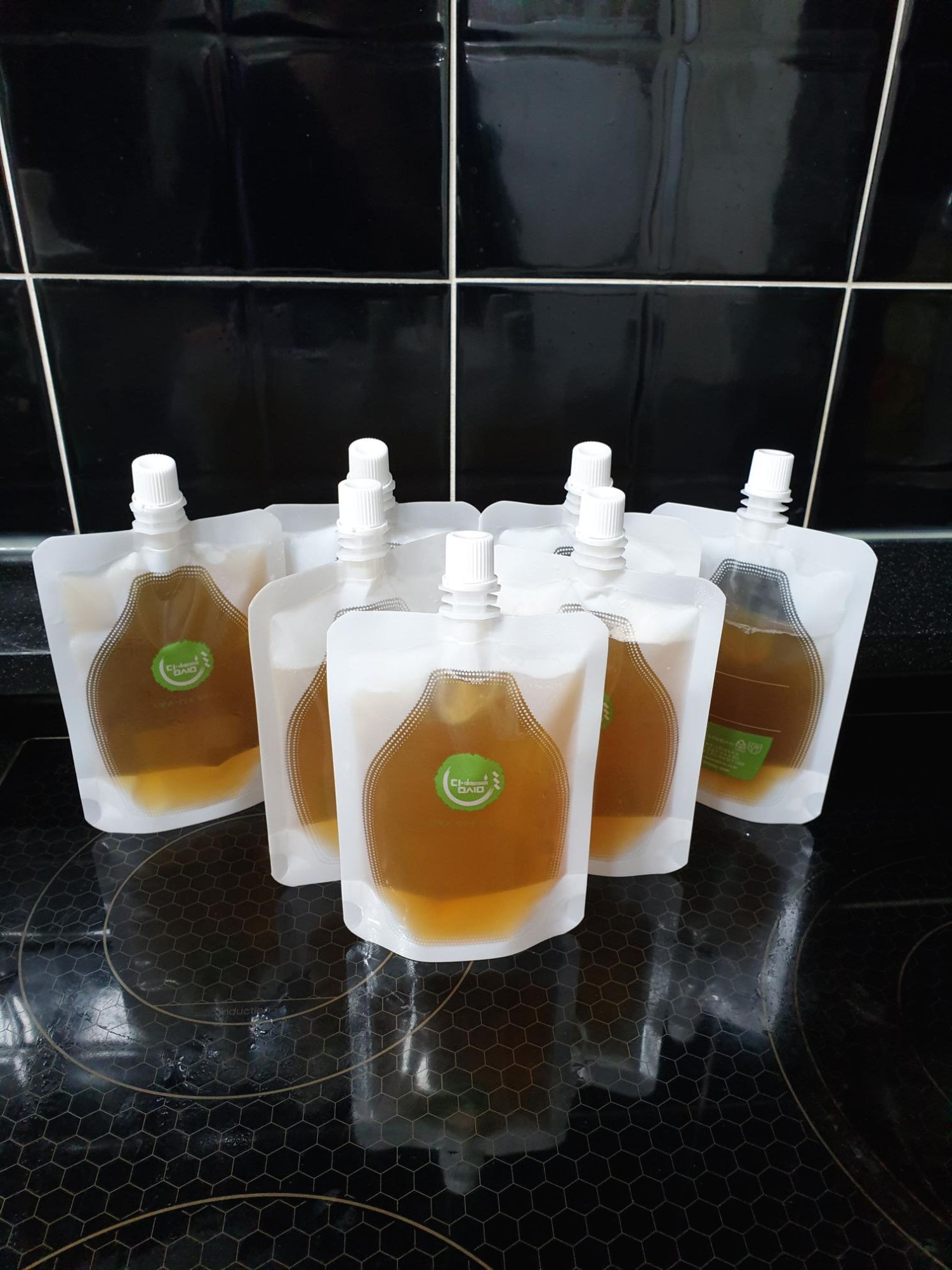 이렇게 담통에 옮겨지는 건강음료를 옆에 파우치에 옮길거에요. 여기까지는 다른 제품과 큰 차이를 느끼지 못 할거에요.